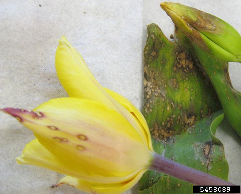 Symptoms of Botrytis tulipae, Tulip Fire, on leaves and petioles.