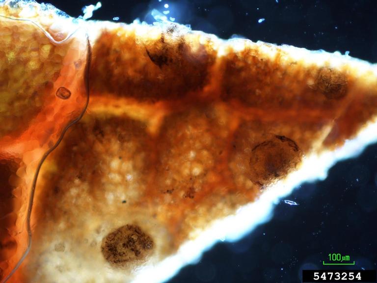 Darkfield observation of three acervular conidiomata of Marssonina fragariae, the anamorph of Diplocarpon earlianum, the cause of strawberry leaf scorch.