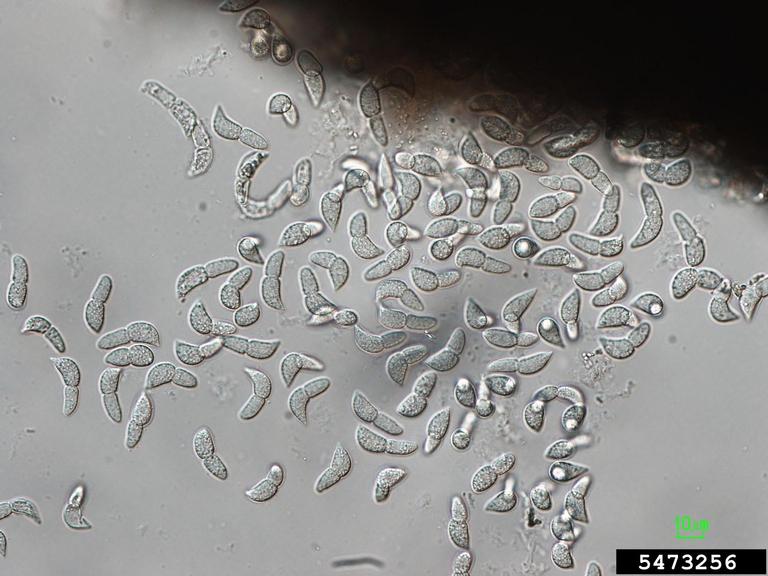 Conidia of Marssonina fragariae, the anamorph of Diplocarpon earlianum, the cause of strawberry leaf scorch.