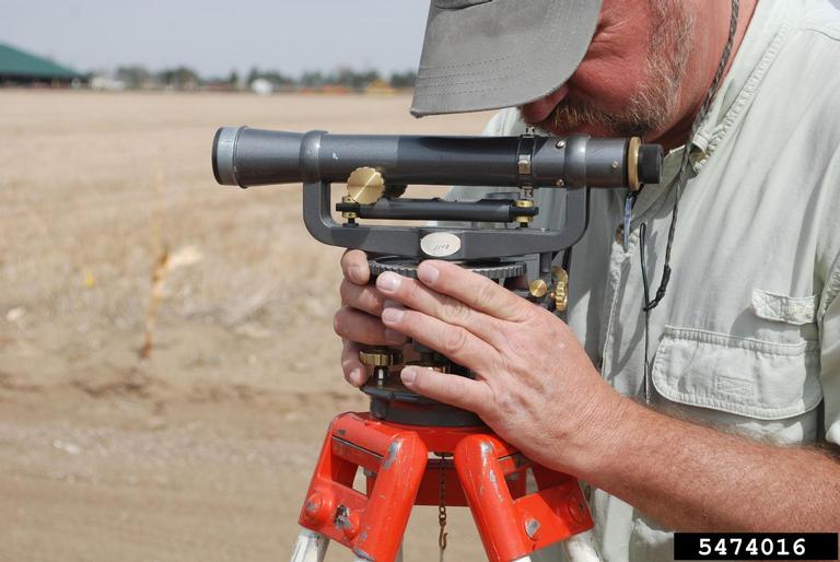 Example of a transit used by surveyors, landscapers, architects and construction workers; a transit measures distance and angles of slope in a predefined area.