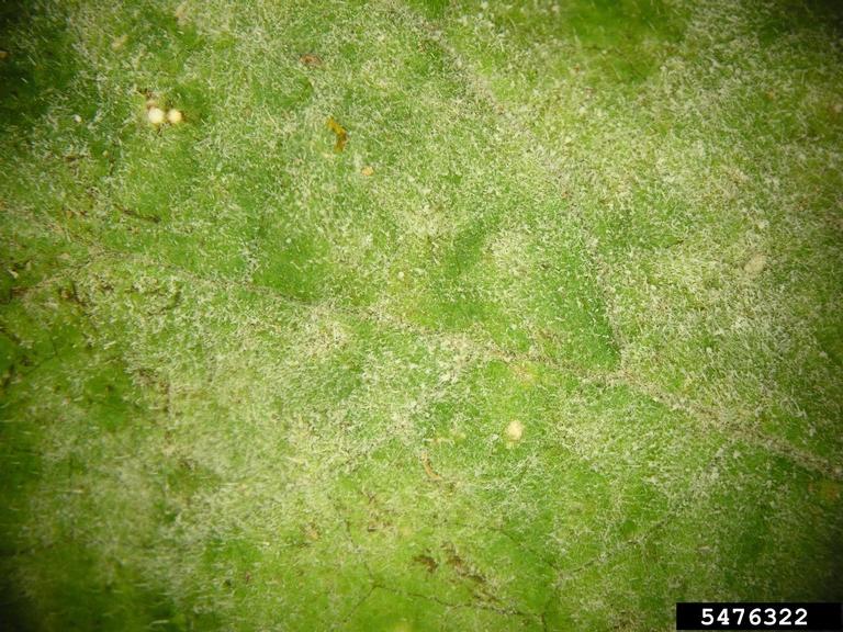 Section of the upper surface of a single pumpkin leaf infected with the Cucurbit Powdery mildew fungus, Podosphaera xanthii.