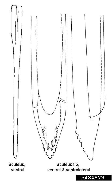 Terminalia (genitalia). Left: aculeus, ventral. Center: aculeus tip, ventral. Right: aculeus tip, ventrolateral.