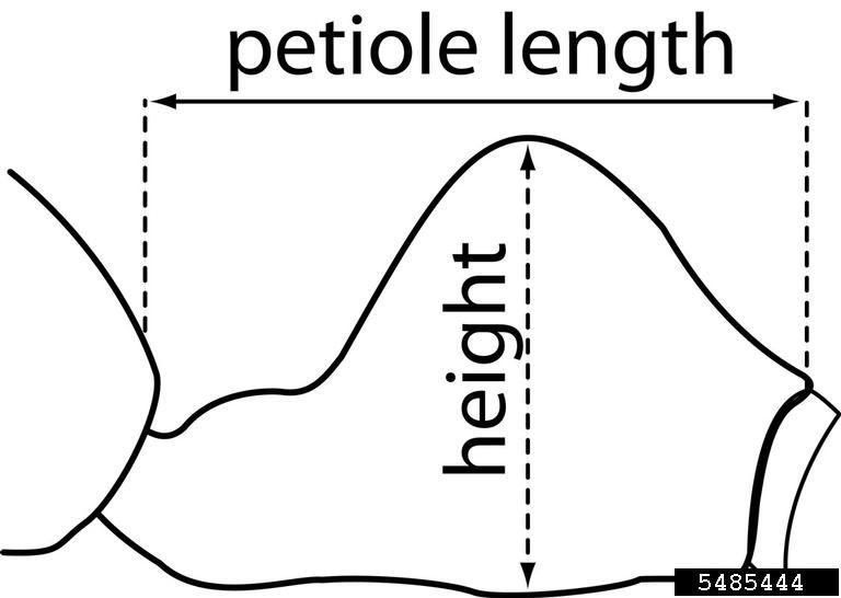 The petiole, in profile, is distinctly longer than it is tall. The length is measured from the most anterior section of the petiolar peduncle to the most posterior section of the petiolar node, and the height is measured from the apex of the petiolar node to its ventral margin. Used in Antkey to separate Monomorium ebeninum and Monomorium floricola from Monomorium liliuokalanii.