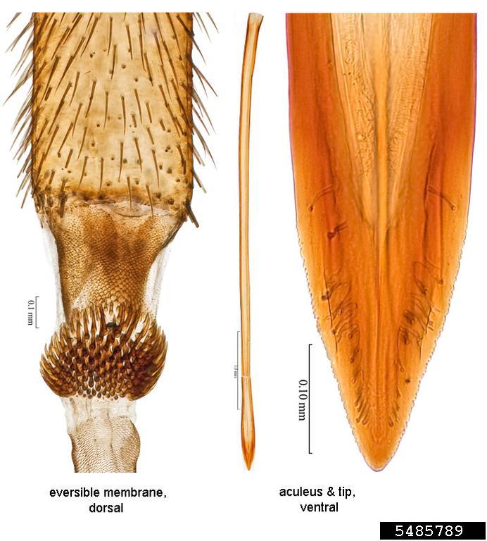 Terminalia (genitalia). Left: eversible membrane, dorsal view. Right: aculeus and aculeus tip, ventral view.