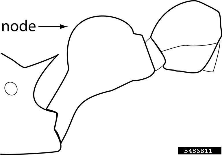 The petiolar node is evenly rounded, with the anterior and posterior faces both approximating similar curves. Used in Antkey to separate Tetramorium tonganum and Tetramorium lanuginosum from all other Tetramorium.
