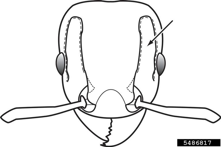Used to distinguish Tetramorium simillimum from Tetramorium caldarium, but can be very subtle and difficult to observe. In the former species, the antennal scrobe is more strongly impressed, and the frontal carina remains a distinct outside border of the scrobe, even at its most posterior section.