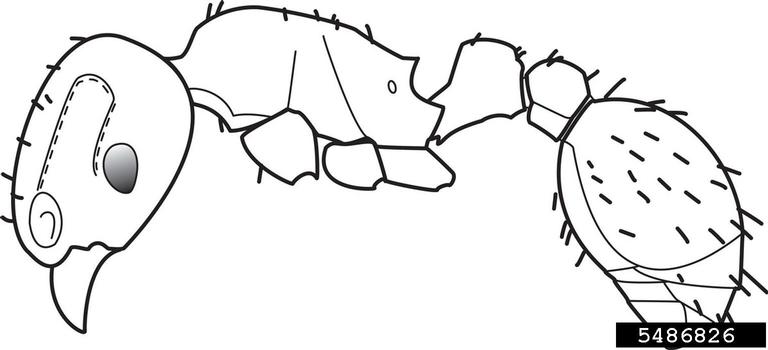 The erect hairs are sparse, short and stubby. They are never long and flexuous and never bifid. Used in Antkey to separate Tetramorium caldarium and Tetramorium simillimum from other Tetramorium species.
