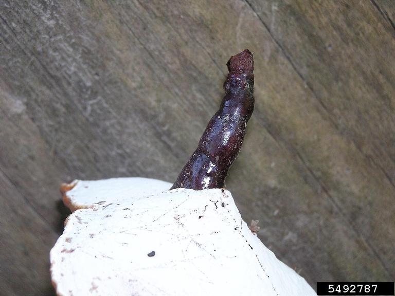 Lacquered polypore is parasitic on living hardwoods and a saprobe on the deadwood of hardwoods. On living hardwoods, it causes a white butt and root rot. It is unusual in that it is an annual rather than a perennial like many polypores.