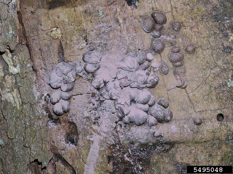 Saprobe slime mold. Grows as scattered single globes to clustered globes tightly packed together on well-rotted wood. Note purple spore color from broken open fruiting bodies. SR 31 rest stop, Union County, Ohio.
