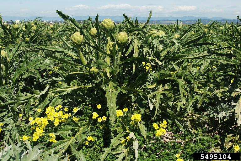 perennial globe artichoke plant, Cynara cardunculus var. scolymus; Oxalis corniculata weed infestation in foreground