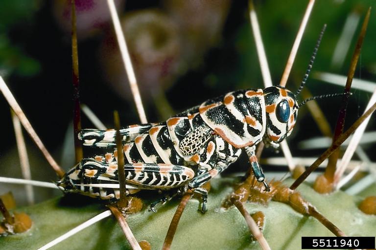 This medium-sized grasshopper is one of the most colorful. Overall body color is bluish to black with bold orange and yellowishwhite markings. The wings are abbreviated and do not extend over the abdomen. It generally is found in western Kansas in grassland and rarely attacks forage crops.