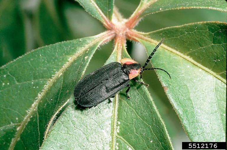 Fireflies of this genus have the head entirely covered by the hood-like pronotum, which in this species is yellow or red with a prominent black band in the middle. The remainder of the body is black or dark blackish-brown. Wings are broad, and specimens appear relatively broad and flat. The body measures from 3/8 to 1/2 inch (9 to 12 mm) in length. The antennae are black, flat, and segments are not saw-toothed. This is the most common black species of firefly in Kansas. It occurs in woods and on low vegetation. Both the larvae and adults of this and other fireflies are predacious and beneficial.