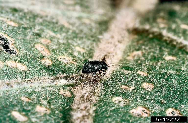 This is a shiny black jumping beetle about 1/16 inch (2 mm) long. They are very damaging to radishes, potatoes and eggplant. Damage is typical of that shown. The adults feed on the upper surface of the leaves and jump when disturbed.