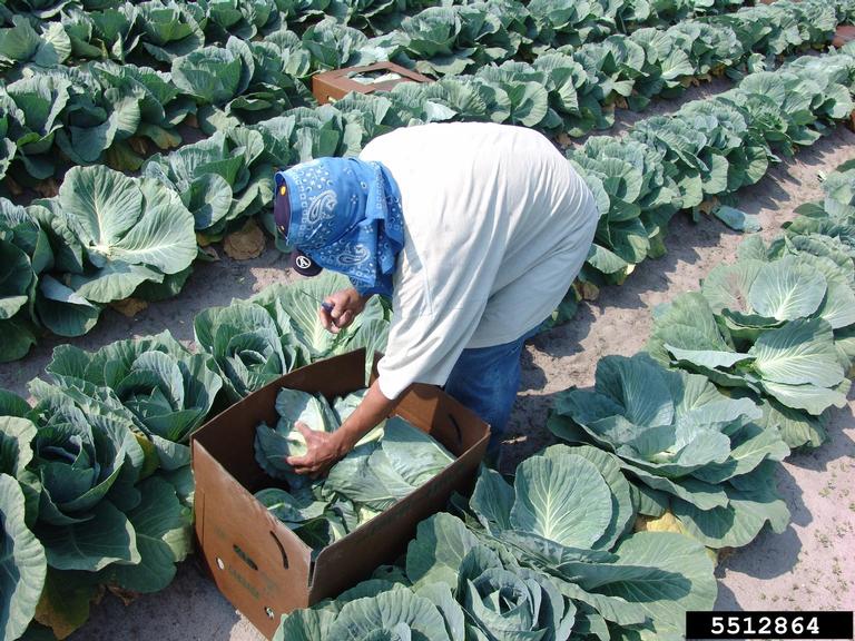 Harvester cutting and trimming a head of cabbage then placing in a carton for shipping. June 2008