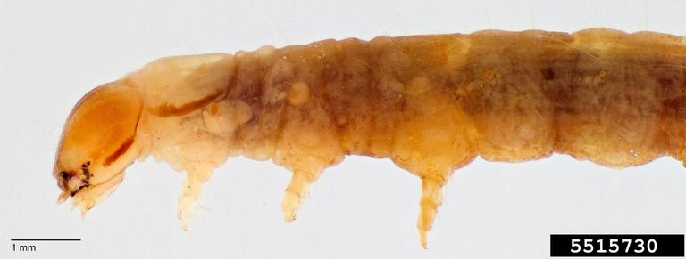 Ohio. Head and thorax; note dark lateral lines on prothoracic shield and head. Lateral view of larval thorax.