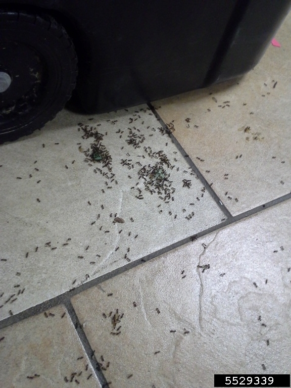 Pavement ant workers foraging around garbage bin inside a building at night.
