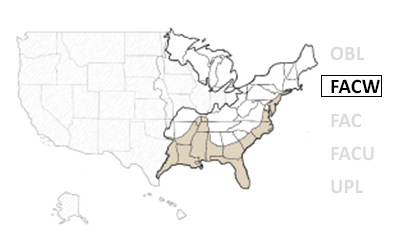 FACW (Facultative wetland): Usually occurs in wetlands (estimated probability 67% - 99%), but occasionally found in non-wetlands